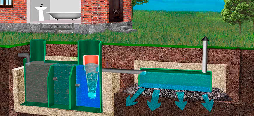 Чтобы понять, что такое септики для канализации, функционирующие по принципу очистки через почву, требуется детально рассмотреть порядок их работы:
