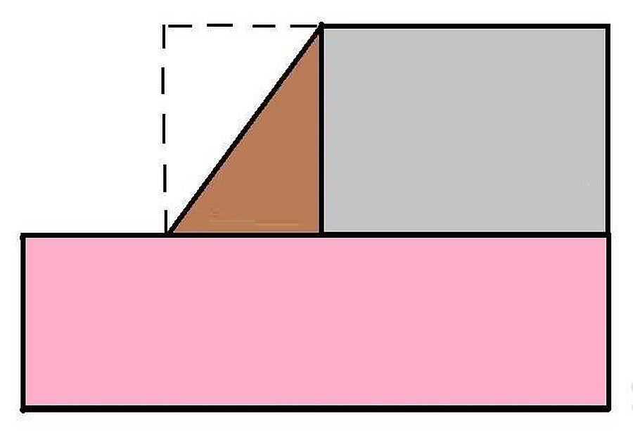Если помещение имеет участок «срезанной» стены, как на рисунке ниже, проще всего дорисовать прямоугольник так, чтобы косая делила его на два треугольника. В этом случае снова-таки получаем Г-образную комнату. Как высчитать ее площадь уже знаем.