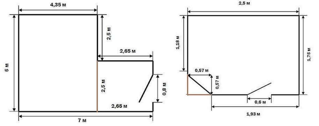 - Находим квадратуру маленького: 2,5 м * 2,65 м = 6,625 м².