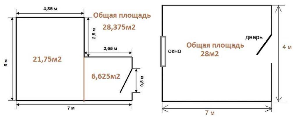 Имея длину и ширину комнаты прямоугольной формы, цифры надо просто перемножить. На рисунке выше такая комната нарисована справа. Длинная стена равна 7 м, короткая — 4 метрам. Перемножаем 7*4 = 28 квадратных метров. Это и есть площадь этого помещения, пола. Другими словами, мы нашли квадратуру. Используя эту цифру, можно покупать напольное покрытие. Но надо иметь в виду, что требуется некоторый запас — на подгонку, подрезку. Чем сложнее схема укладки и чем больше фрагменты напольного покрытия, тем запас должен быть больше.