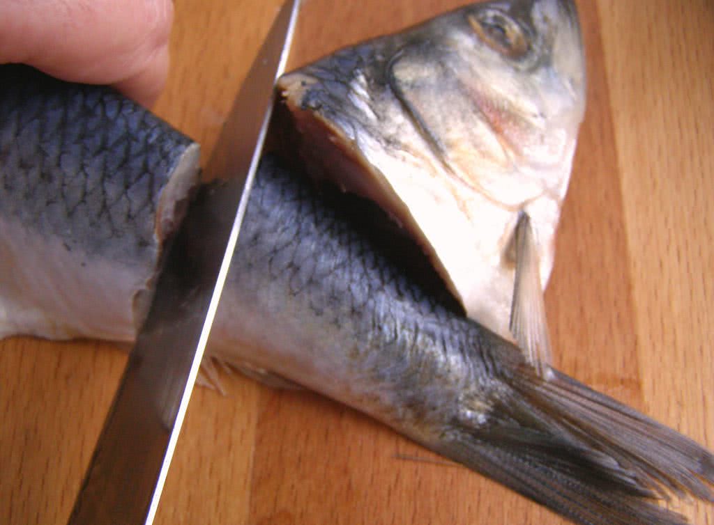 - Нужно перерезать хребет рыбины у головы. Затем следует потянуть голову к себе. Это позволит быстро отделить внутренности.