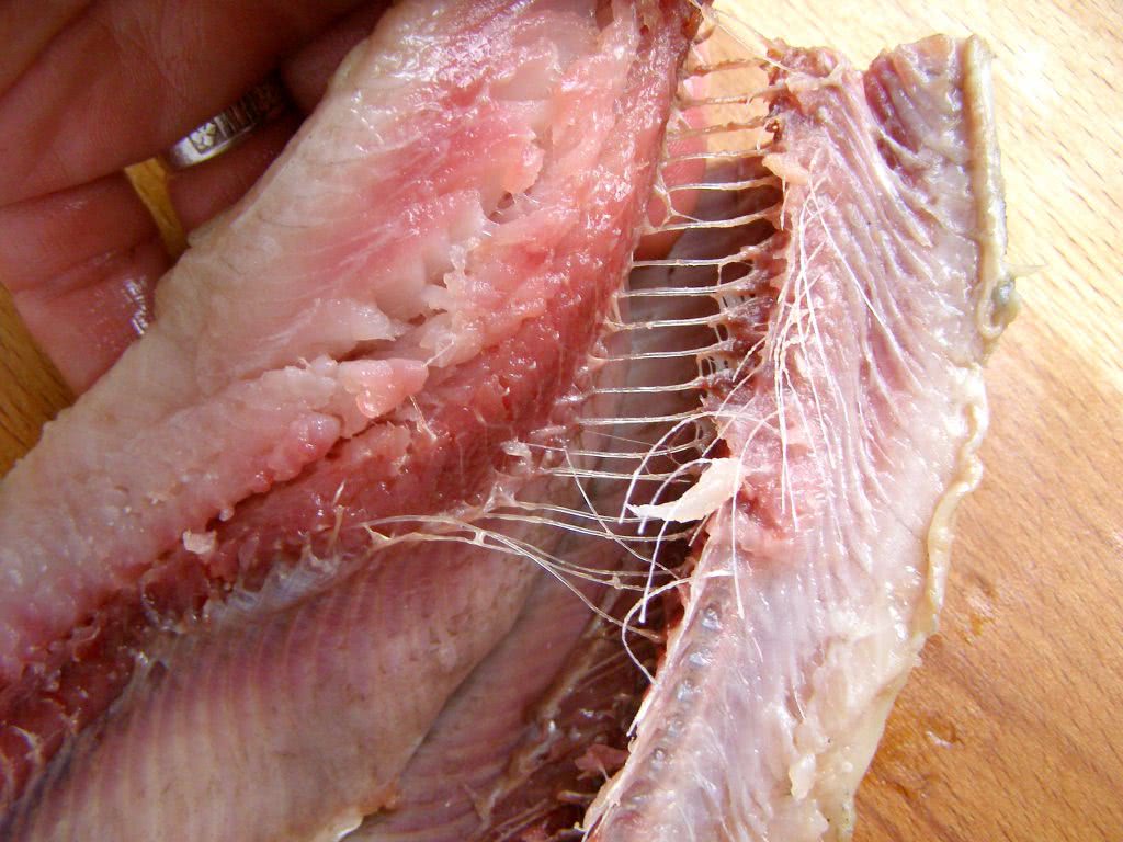 Нащупав хребет, веду палец вначале вдоль всего хребта – с обеих сторон, затем — вниз по костям хребта. И так – до самого конца, пока не почувствую, что мякоть аккуратно отделилась от крупных и мелких косточек.