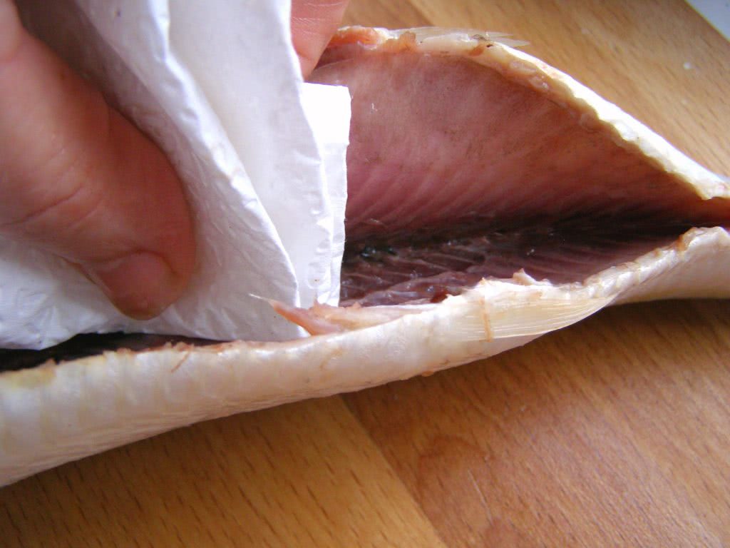 - Удаляйте чёрную плёнку бумажной салфеткой или руками, она придаёт горький вкус блюдам. Промойте рыбу как снаружи, так и внутри под водой из-под крана.