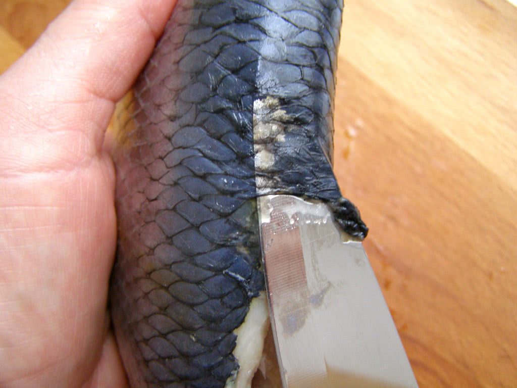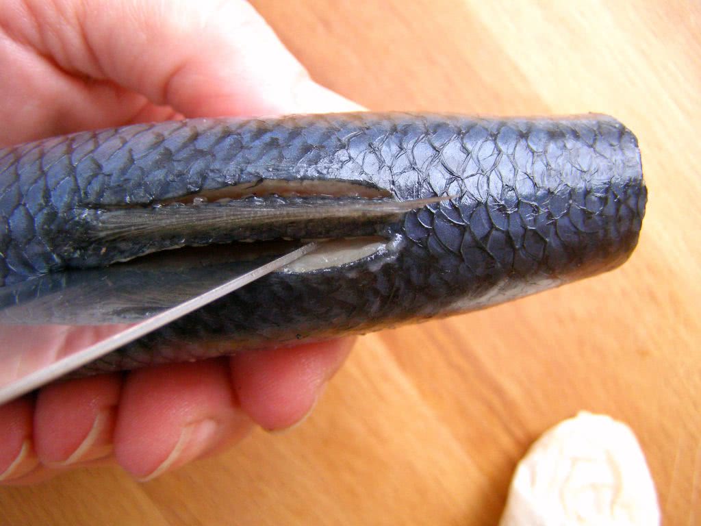 Надрезаем кожицу снизу от хвоста до места, где вырван хвостовой плавник.