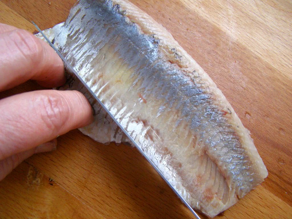 По истечении этого времени рыбку надо будет достать из рассола, ополоснуть, а затем легко удалить все косточки при помощи пинцета. Ну и наконец, хотим вам рассказать о радикальном, но очень быстром методе удаления мелких костей. Для того чтобы избавиться от них одним движение вам надо будет взять и аккуратно провести ножом продольную линию по верхней части филе (ее ширина должна быть приблизительно 5 мм). Сделав это, вы сразу удалите все кости и вам не придется тратить время на их поиски руками и удаление пинцетом.