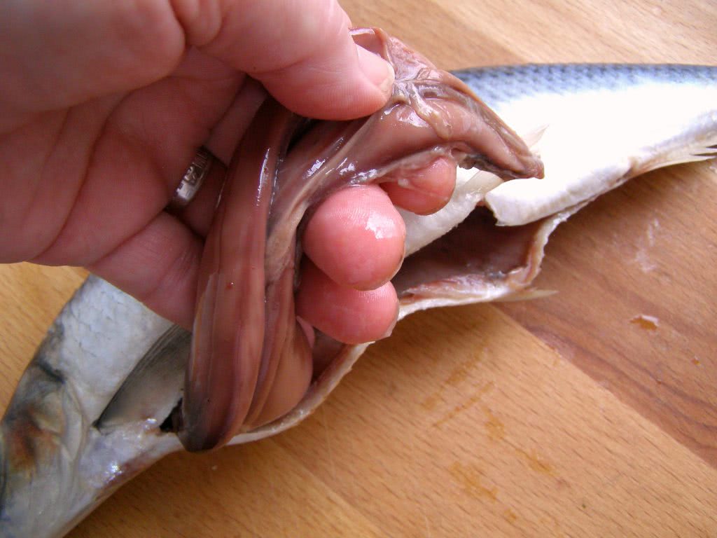 Нельзя не упомянуть такой интересный метод, как продавливание, ведь для финальной очистки селедки в этом случае не требуется ни ножа, ни ножниц, только руки. Для этого рыбина сначала отделяется от внутренностей, кожи и плавников, и промывается под холодным краном. Тушка берется в одну руку, причем большой палец должен очутиться сверху спинки, а остальные – уже внутри. Пальцы начинают сжиматься, и при помощи выдавливающего движения мясо отделяется от костей. Таким образом, прорабатывается сначала одна часть рыбины, а затем – вторая. Остатки устраняются при помощи пинцета.