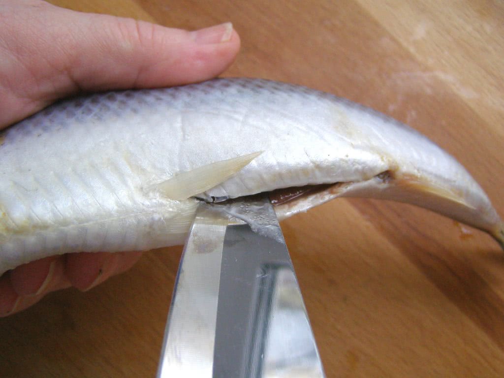 - Придерживая селёдку за плавник сверху, аккуратно обрезают его.