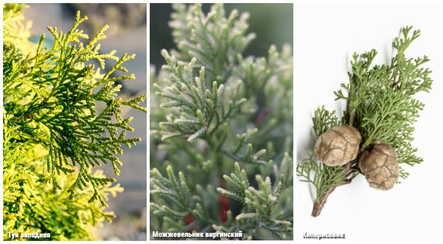 Кипарисовик. Хвоя часто похожа на можжевельник, но у многих видов есть серебристая изнанка и отметины на нижней стороне хвои.