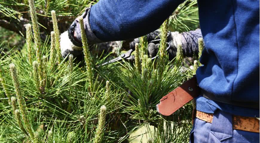 Метод обрезки сосен. Сосну следует обрезать во время активного роста побегов, это даст достаточно времени, чтобы на побегах образовались новые почки для роста в следующем году. Новые побеги текущего года, или «свечи», можно срезать ручным секатором или просто отщипнуть до нужной длины.