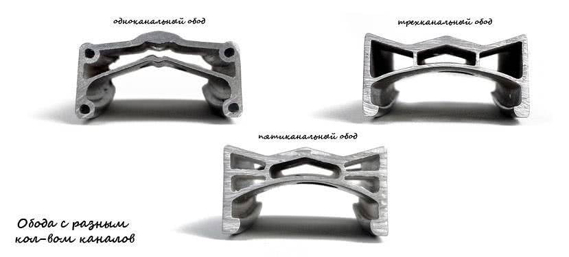 Вертикальные перемычки образуют каналы, идущие по направлению вращения. По количеству таких каналов современные обода делятся на одно, трех- и пятиштучные: