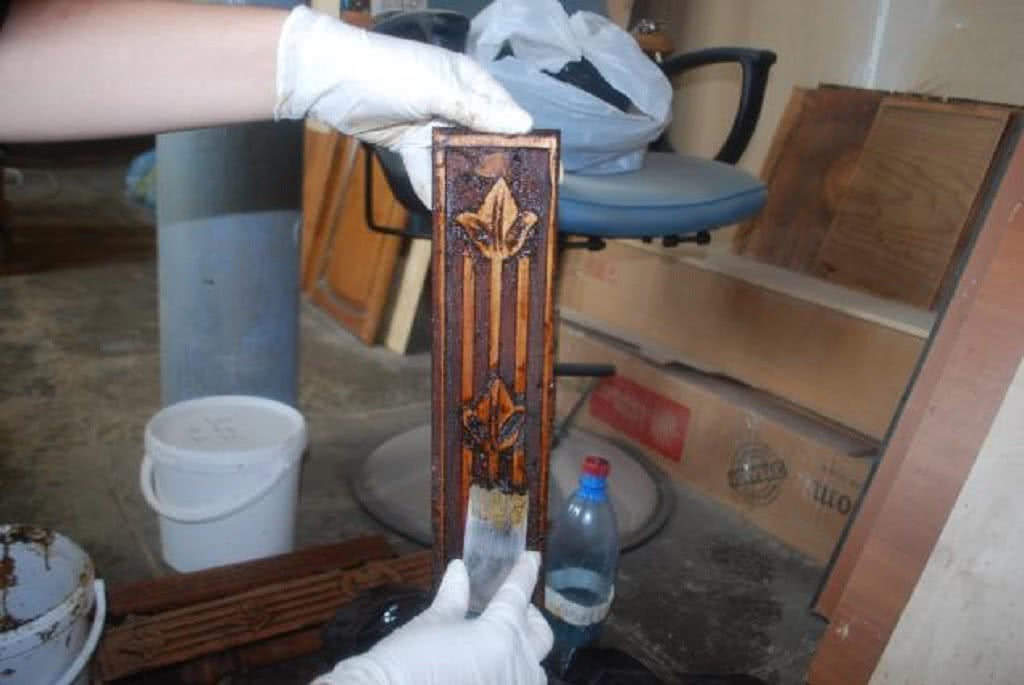 Далее снимаем старый слой покрытия, избавляемся от опухших пятен – снимаем при необходимости верхний слой дерева. Неровности на деревянных поверхностях устраняют с помощью электрической варочной панели. Иногда приходится использовать посторонние предметы, чтобы избавиться от пыли, попавшей в щели – старой зубной щеткой. Ручки откручиваются, а те, которые не подлежат восстановлению, заменяют на новую фурнитуру. Затем их промывают, дают высохнуть и покрывают грунтовкой. Если материал не дерево, то шпаклевка.