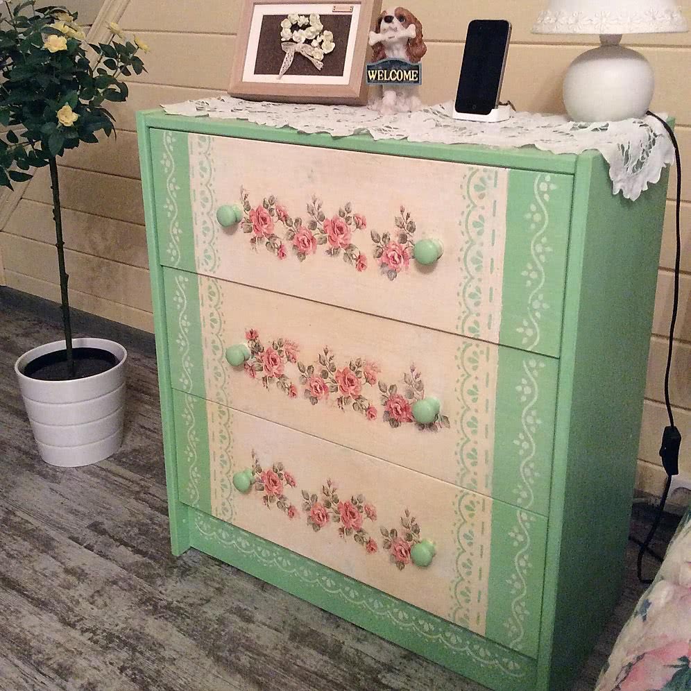 Как гласит Википедия, декупаж – это декорирование предметов с помощью салфеток, картинок, ткани или фотографий. Техника подойдет новичкам. Все, что вам нужно – вырезать приглянувшуюся иллюстрацию по контуру (можно использовать декупажные карты, обычные трехслойные салфетки, открытки) и приклеить ее на выбранный участок клеем ПВА. Cмешать 2 части клея с 3 частями воды и покрыть картинку готовой смесью. Финальный слой лака, и обычный комод превращается в произведение искусства.