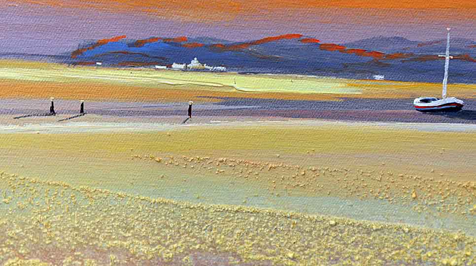 Присмотритесь, к деталям — фигурам людей, лодкам, посмотрите как нарисованы горы, одними штрихами. Вы бываете на выставках, в музеях изобразительного искусства? Заглядываете в витрины магазинов? Мой непрофессиональный совет, который мне очень помог нарисовать некоторые картины своими руками — сфотографируйте понравившееся полотно, сначала целиком (потом сделаете контуры в фотошопе и переведете на холст), а потом и все детали крупно по отдельности режимом макро (чтобы все мелочи были четко видны), дома рассмотрите. И рисуйте! Попробуйте!