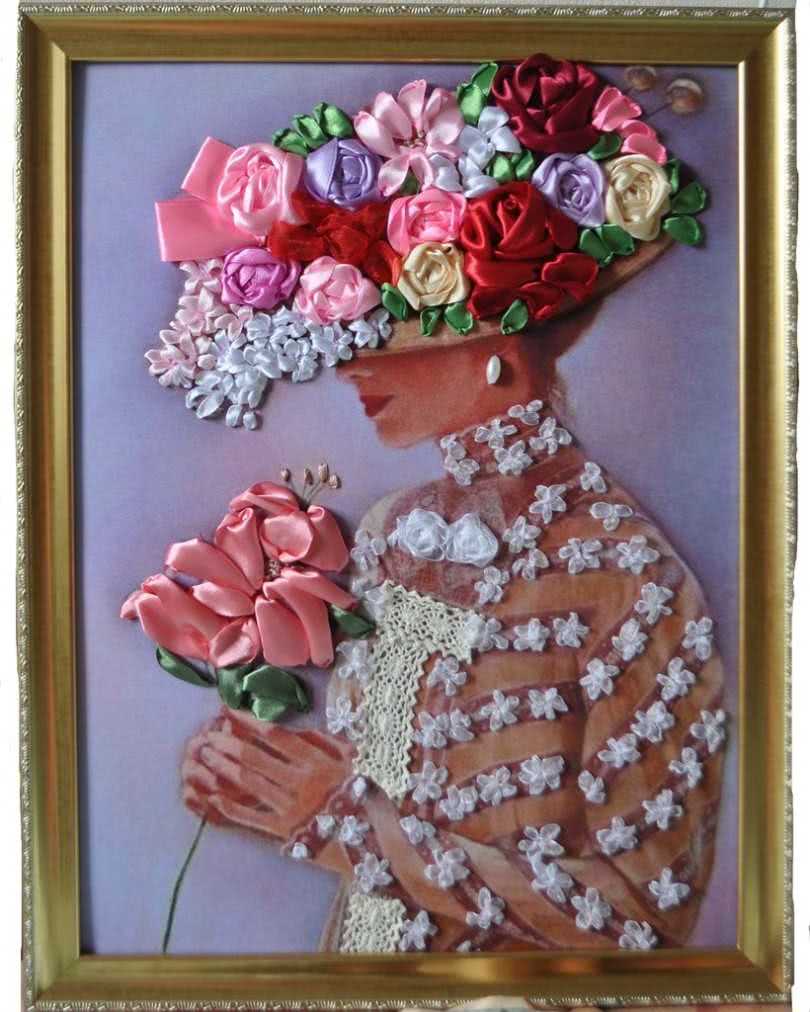 А как вам такой пейзаж? По-моему, удивительно красиво. Немного абстрактная картина, но зато как хочешь так и понимай. Нарисованы или воздушные шарики, или осенний пейзаж с деревьями. Знаете, откуда такой чудесный блеск? Все очень просто — это блестит ниточка из натурального шелка. Да-да, работа очень кропотливая. Тоненькой ниткой выложена вся поверхность!