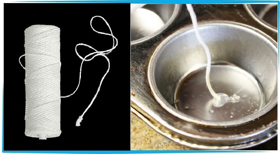 Второй этап – изготовление фитиля. Для этого берется хлопчатобумажная нить. Оригинально смотрится фитиль из цветных ниток мулине.