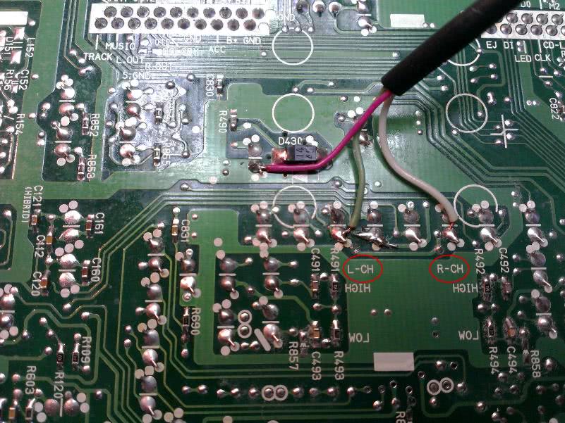 Линейный вход правого канала отмечается R-CH (расшифровывается right channel, то есть правый канал) и к этой точке следует припаять один из проводников кабеля. Вторую жилу кабеля необходимо присоединить к контакту входа левого канала, который маркируется L-CH (транскрипция left channel, то есть левый канал). Общий проводник нужно припаять к дорожке GND, которая соединена с корпусом магнитолы и минусом аккумулятора. Эта дорожка — самая широкая и покрывает значительную часть печатной платы.