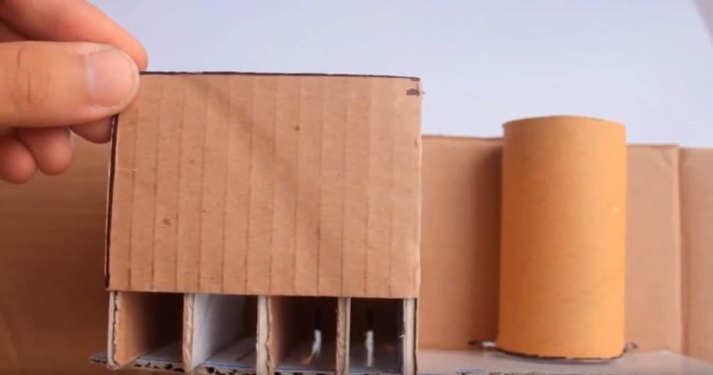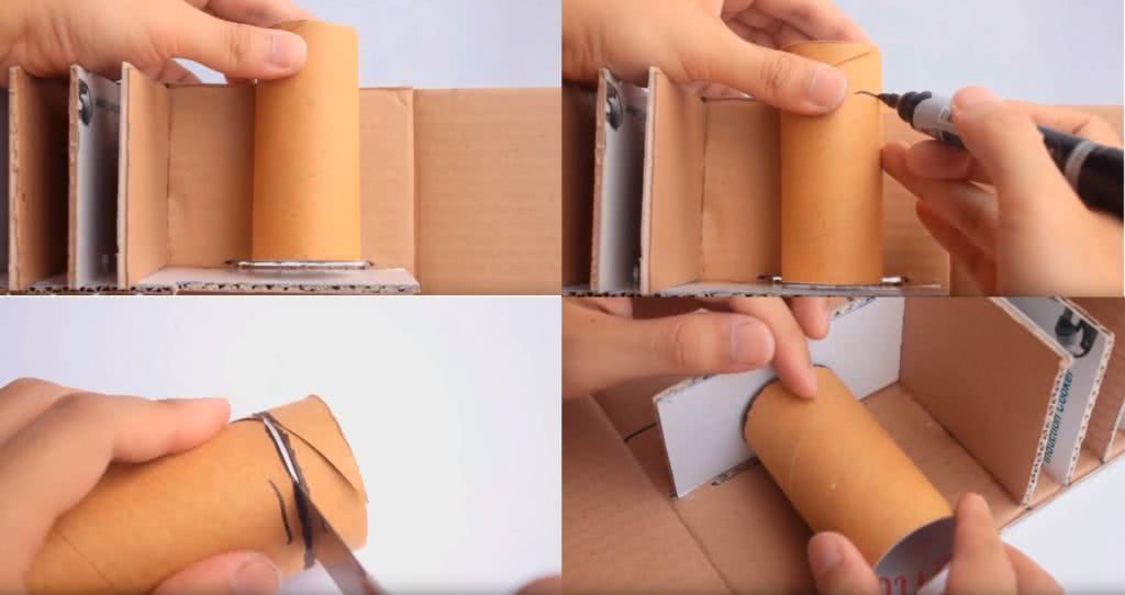Взять туалетную втулку и приложить ее к основе. Держать деталь необходимо на расстоянии 5 мм от картонной стенки. Отметить маркером необходимый размер втулки. Она не должна быть выше основной стенки будущего банкомата. Отрезать канцелярским ножом лишнюю часть. Зафиксировать втулку на основной стенке банкомата. Это будет отделением для монет.