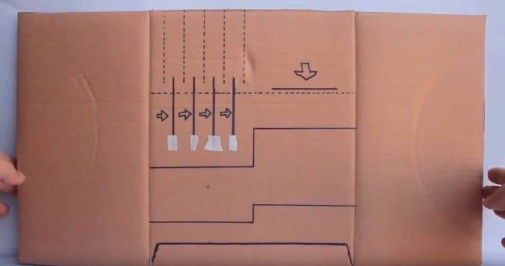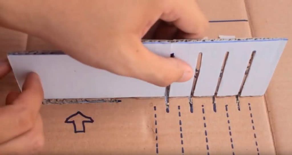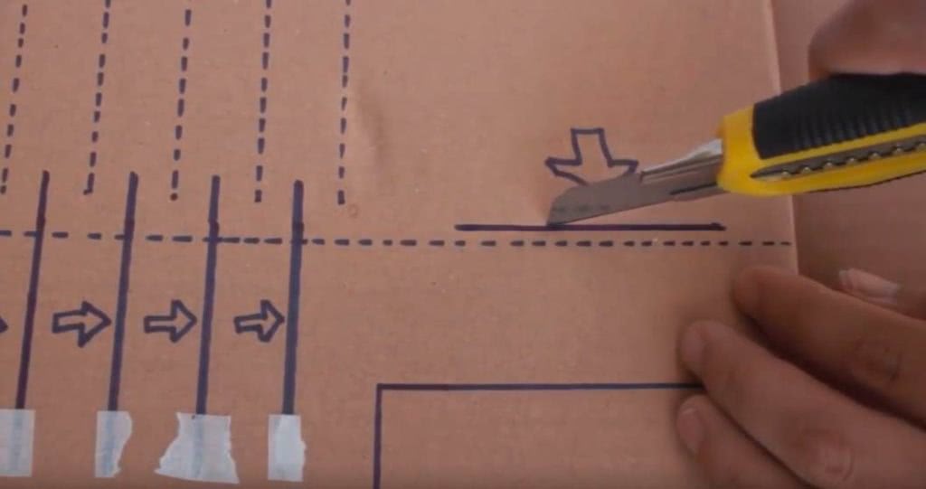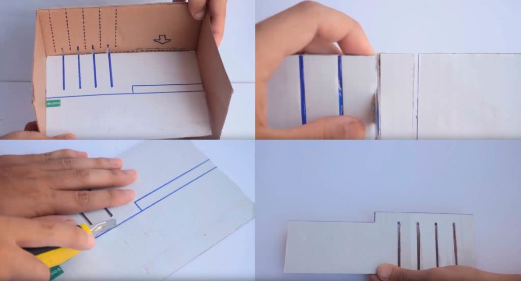 Взять лист картона и начертить на нем линии, как показано ниже. Надрезать детали строго по сплошным перпендикулярным линиям. Разделить заготовку пополам.