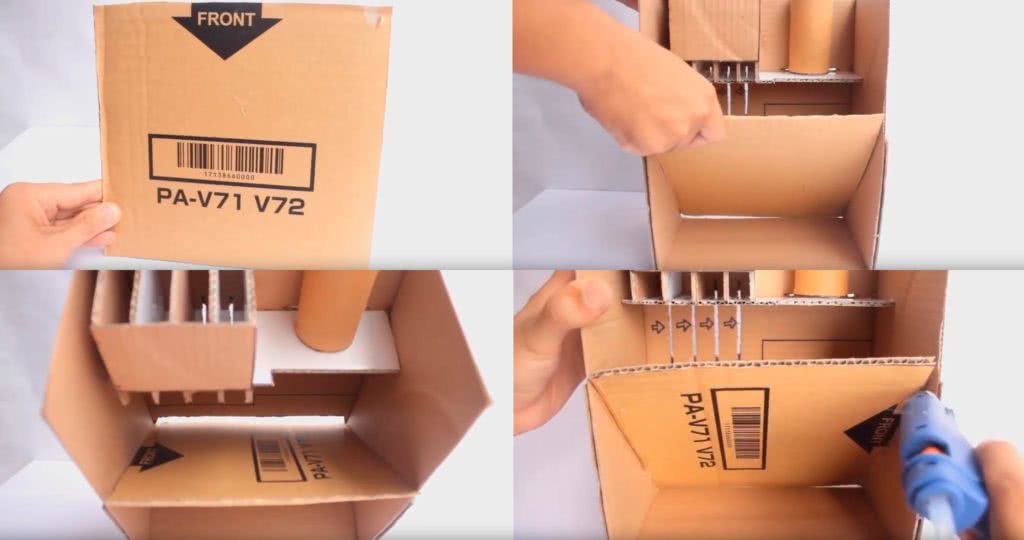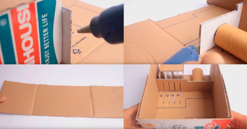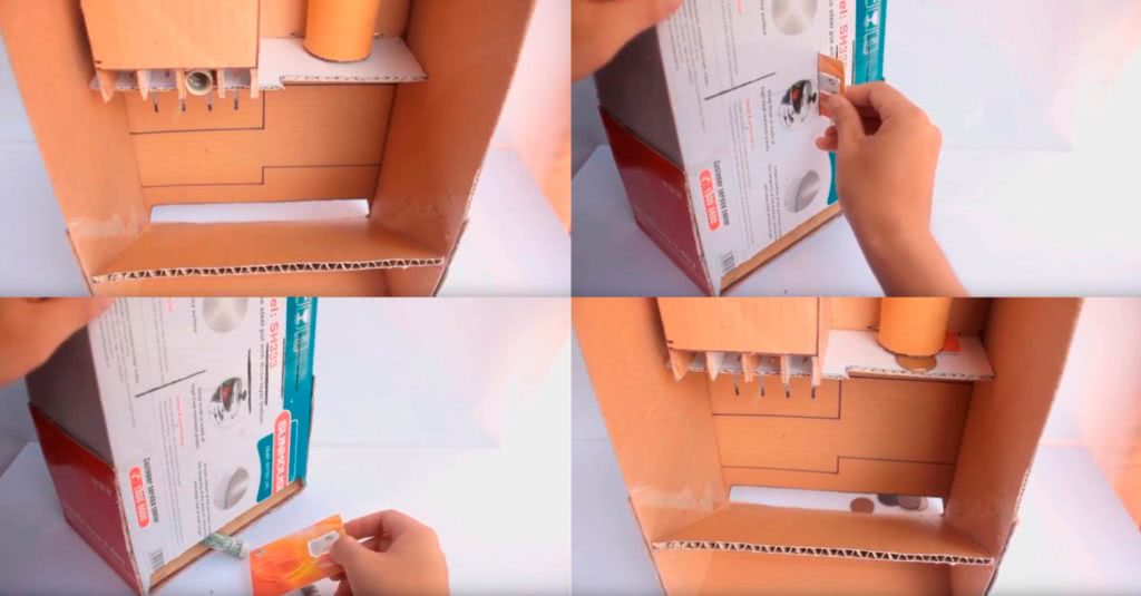 Нанести клей на боковые детали и сложить коробку. Вырезать деталь, как показано ниже. Это будет дно банкомата. Приклеить деталь к основной части поделки.