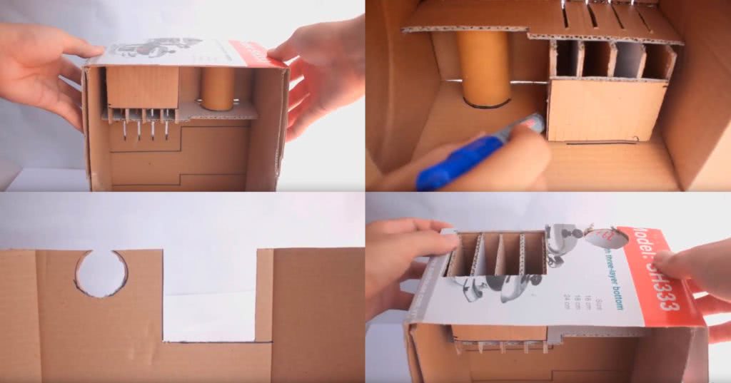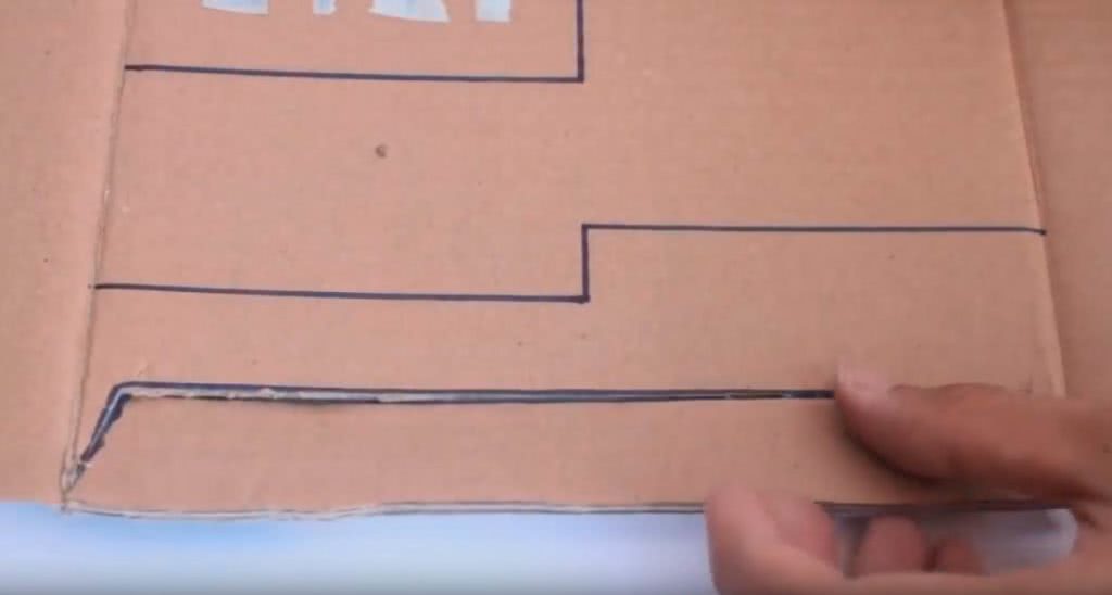 Вырезать с помощью канцелярского ножа отверстия. Это необходимо сделать строго по сплошным линиям. Как только они будут готовы, необходимо вставить в отверстие карточку. Она должна легко входить в будущий банкомат.