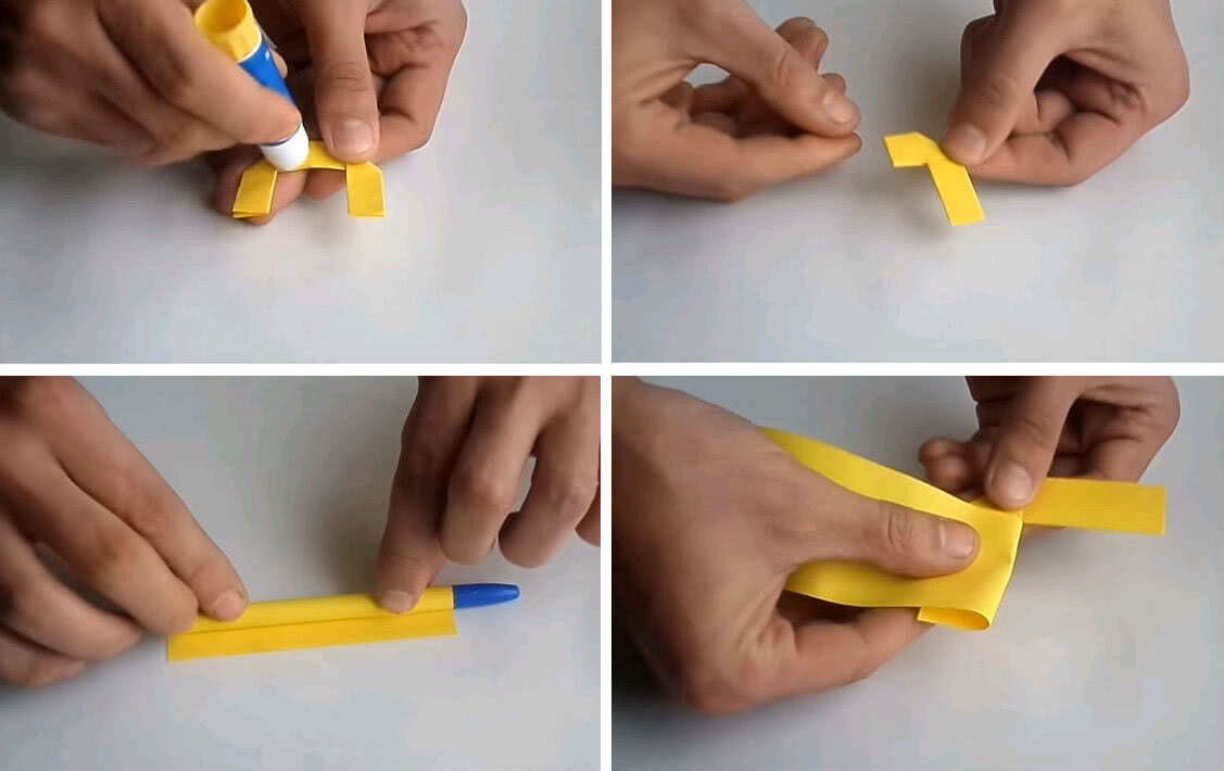 - Сложите еще 2 листа один на один и сверните в трубочку, которая не должна превышать толщину корпуса. Ее нужно немного примять, чтобы подошли размеры. С двух сторон трубочки сделайте ножницами косой срез (в одну сторону). Эта заготовка должна быть похожа на рукоятку пистолета. После сверните несколько раз лист бумаги для того, чтобы сделать скобу и спусковой крючок. Все полученные элементы прикрепите к основной части скотчем.