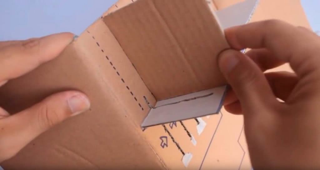 Вырезать из картона прямоугольник, как показано ниже. Перевернуть заготовку и обвести маркером детали. Дочертить заготовки и вырезать их. Приклеить деталь к основной части.
