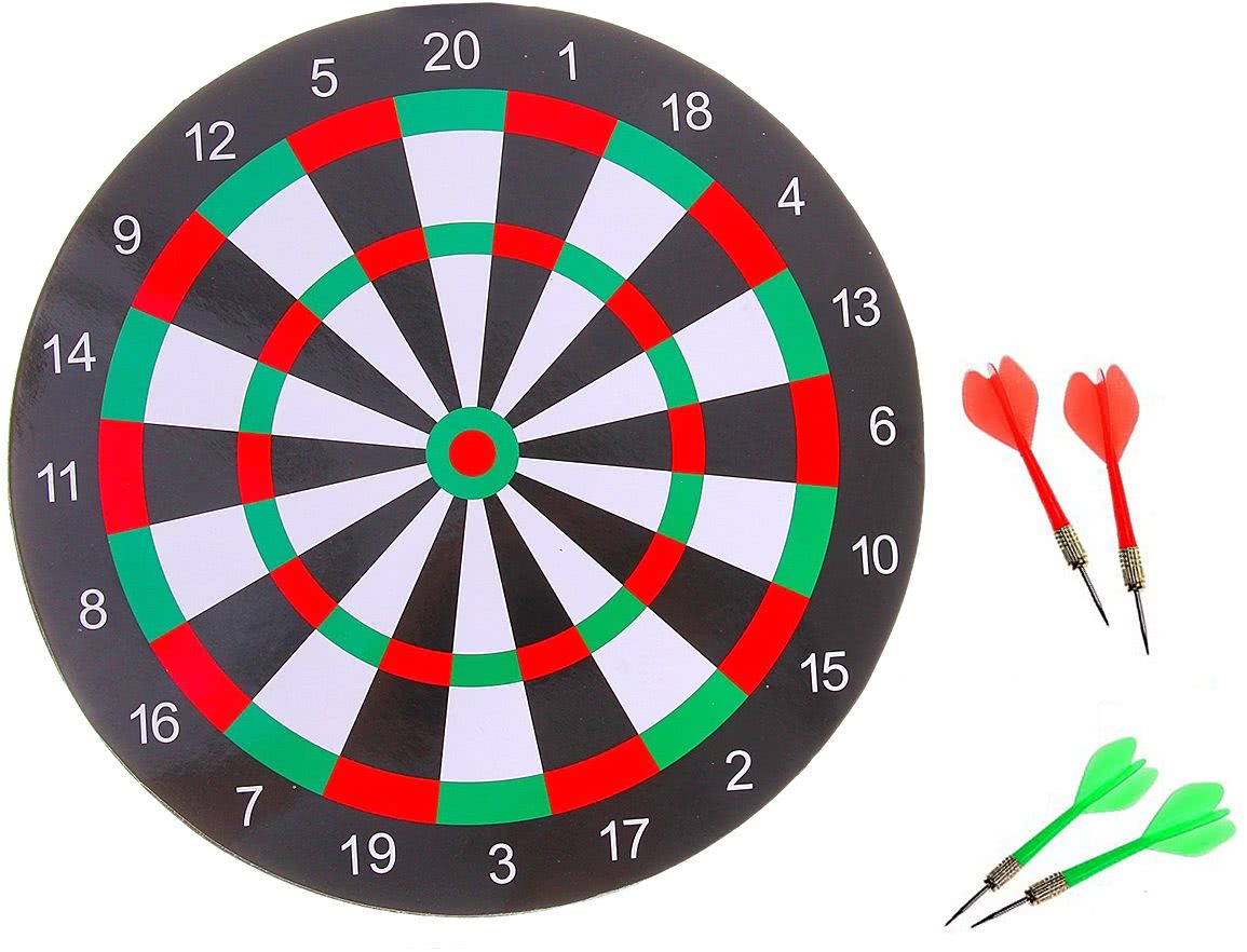 - Мишень. Обычно она изготовлена из спрессованных волокон агавы. Форма и размеры мишени всегда стандартны. Это круг диаметром 45 см и толщиной 4 см, разделенный на черно-белые секторы тремя концентрическими красными и зелеными кольцами и 20 радиусами. У каждого из них имеется свой номер, расположенный хаотично, по площади они одинаковы. Мишень должна находиться на высоте 1,73 м от пола.