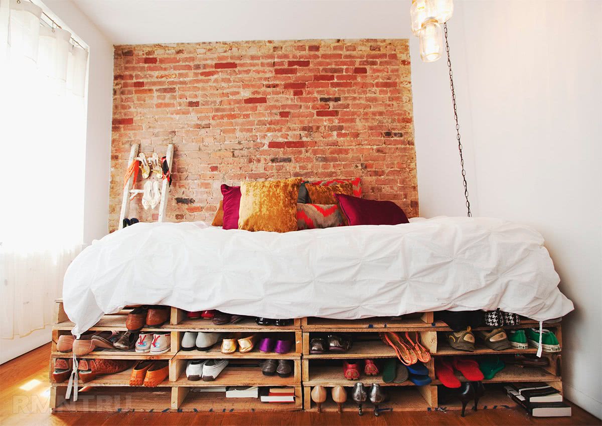 Если кровать изготовлена в виде простого подиума с лежащим наверху матрацем, это тоже открывает огромные просторы для творческой мысли. Ведь изголовье такого ложа можно оформить, как угодно: например, достать из кладовки старые доски, отмыть их, покрыть сверху лаком, написать на них что-нибудь на непонятном языке, прикрепить на стену в изголовье кровати — и мистическая «бюджетная» спальня в стиле хенд-мейд готова.