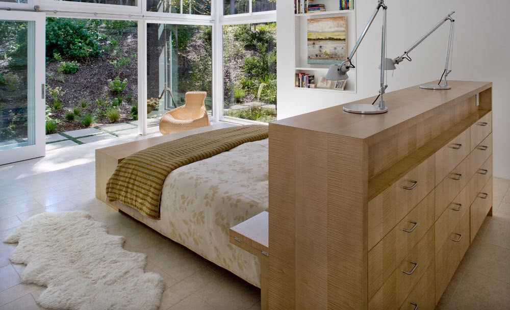 Выдвижная кровать из подиума станет оптимальным решением в том случае, когда нужно создать уютное интерьерное пространство в небольшом помещении. В дневное время ее можно убрать внутрь подиума, тем самым освободив место для приема гостей.