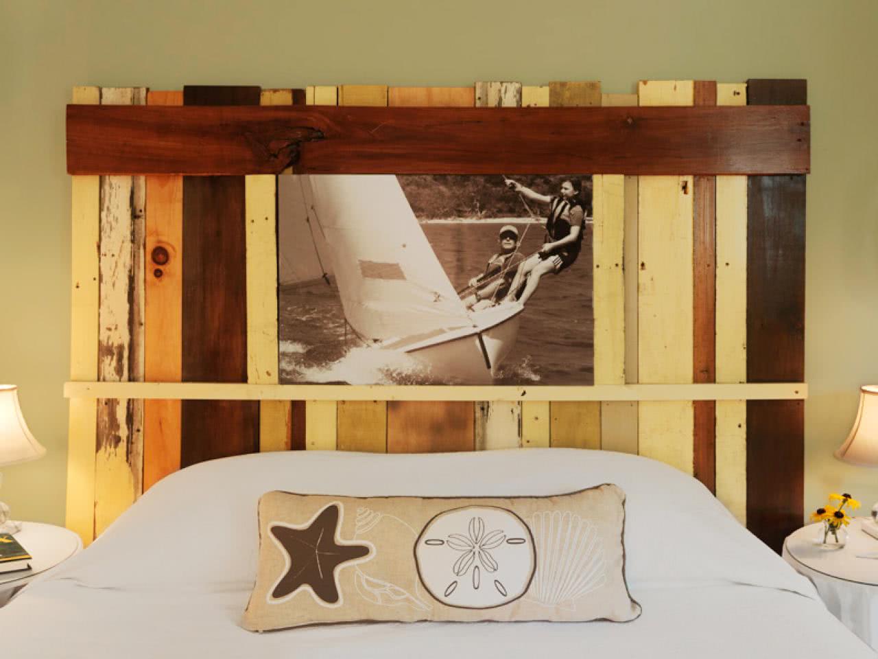 Обычные доски, долго лежащие в сарае, не стоит выбрасывать. Их тоже можно использовать для создания прекрасной деревенской атмосферы, украсив ими изголовье небольшой кровати на даче. Доски предварительно подгоняются по размеру, ошкуриваются и покрываются лаком. Красить их в другой цвет не стоит – лучше взять морилку для того, чтобы усилить их темный, затронутый временем цвет. На кровать можно положить лоскутное одеяло и разноцветные подушки.