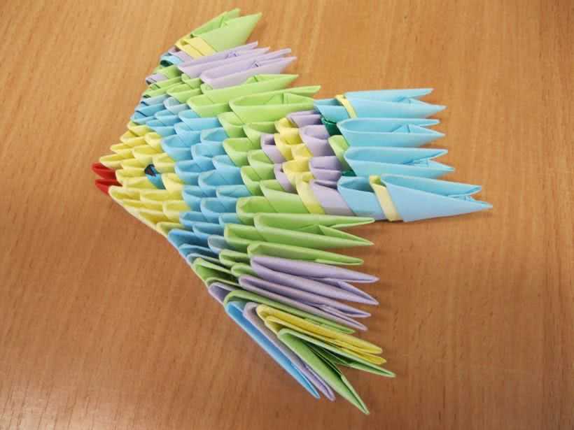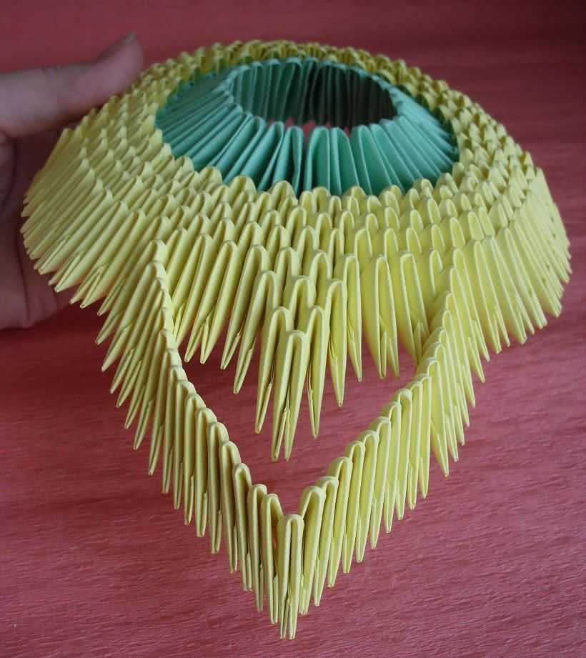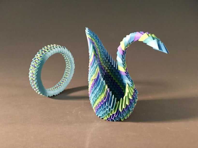Если поделка предполагает подвижные части, её сборка в этих участках происходит так: первый модуль переворачивают протяжкой вверх, а на его угол насаживают следующий элемент, используя классический способ.