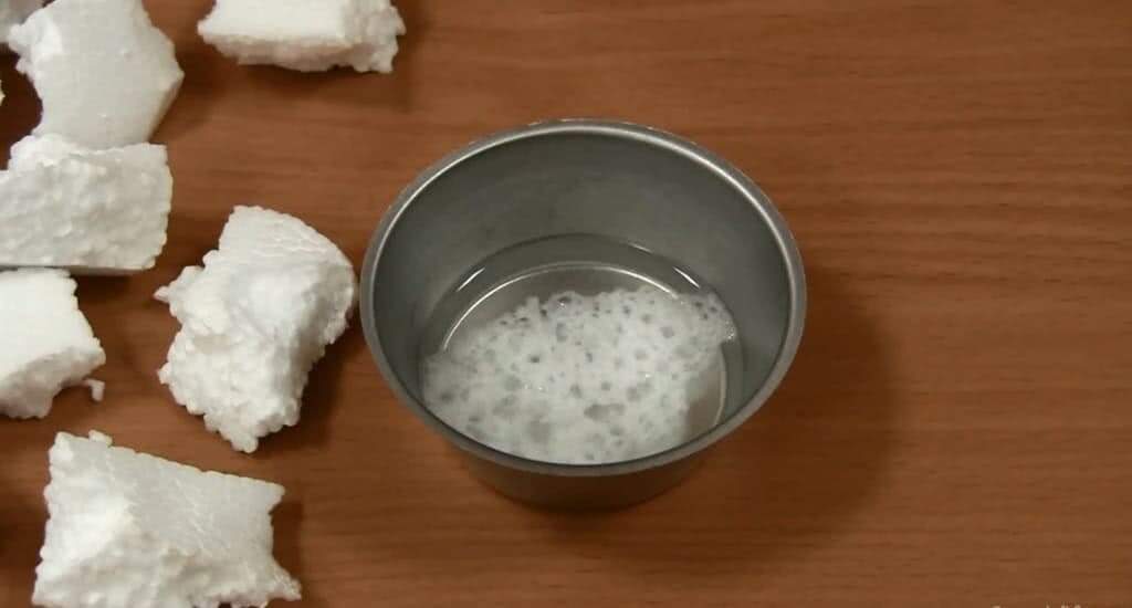 Низкая стоимость такого состава во многом объясняет его популярность. Необходимое количество пенопласта помещают в устойчивую к соответствующим химическим соединениям тару. Его заливают бензином. С применением перемешивания создают достаточно однородную вязкую массу. Ее наносят на обезжиренные поверхности, сжимают, оставляют в таком положении до полного высыхания. Чтобы создать нужное усилие применяют груз, струбцину, тиски.