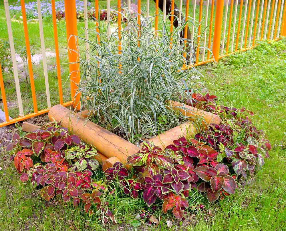 Если ваш дом сделан в виде сруба, то и клумбу можно сделать с рублеными стенками. Подберите одинаковые обрезки бревен небольшого диаметра, у каждого бревнышка (кроме четырех нижних) с одной стороны по всей длине выберите паз глубиной около половины диаметра. Для соединения бревен в венцы на каждом бревне (кроме двух нижних) вырежьте по две чашки; два нижних бревна стешите по одной стороне на половину диаметра.