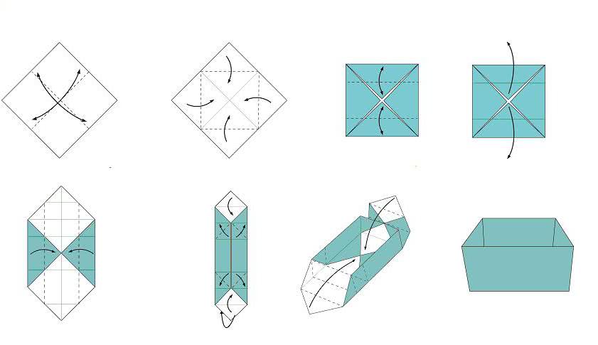 Это традиционная коробочка известного мастера Фумиаки Шингу. Для работы нужен ровный квадратный лист. Он сгибается и разгибается, как указано стрелками на рисунке.