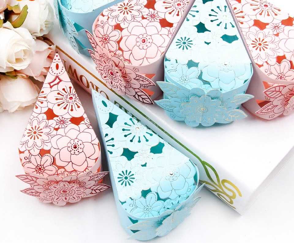- Набор из треугольных коробочек. Такой вариант оптимален, когда необходимо оформить подарки для целой компании. Сперва требуется по шаблону создать нужное количество треугольных упаковок, а затем объединить их в единый круглый торт, скрепленный лентой.