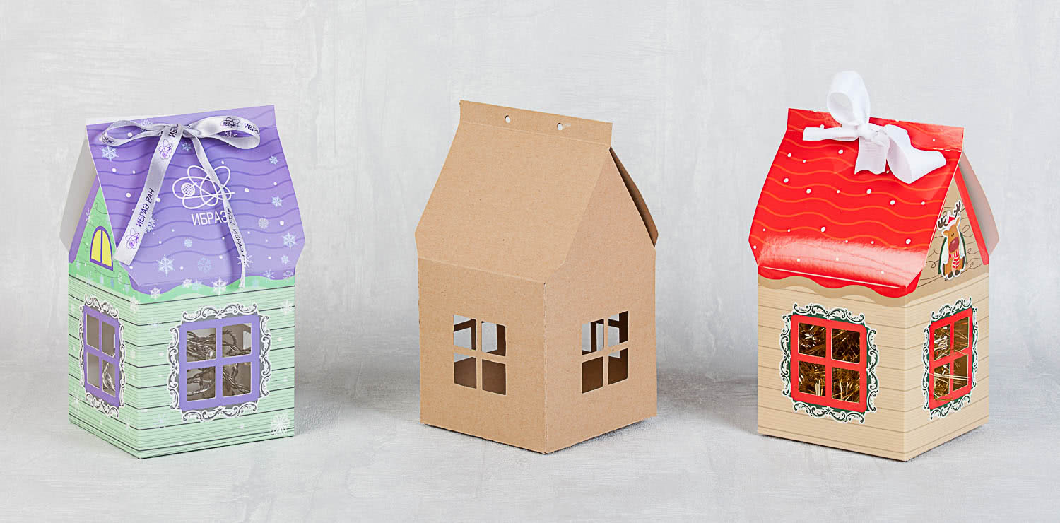 - Коробка-домик. Она изготавливается по достаточно простой схеме, но может стать отличной упаковкой для любого подарка. Для нее требуется прямоугольник для крыши и пара одинаковых заготовок из крафт-бумаги. Все детали склеиваются при помощи пистолета.