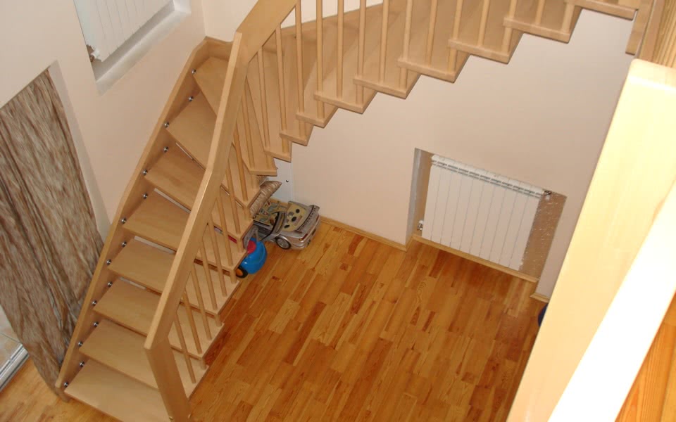 От того, какой материал выбран для строительства лестницы, зависит окончательная стоимость готового изделия и эстетичный вид помещения. В качестве древесины для ступеней используют дуб, клен, сосну. Для изготовления балясин потребуются бруски дерева высотой в пятьдесят сантиметров или металлические прутья. Можно заказать выточить фигурные балясины из дерева или выковать ажурные металлические. Для изготовления перил можно взять деревянные бруски, обточенные фрезой, или блок-хаус. При отсутствии опыта в обработке древесины или нужного оборудования можно заказать нарезку и шлифовку ступеней, перил и балясин. А монтаж изделия можно проводить самостоятельно.