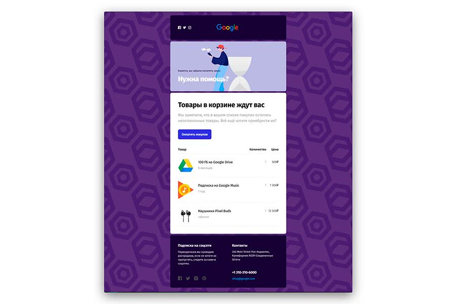 Допустим, мы из магазина Google и нам нужна рассылка с напоминанием о неоплаченных товарах в корзине.