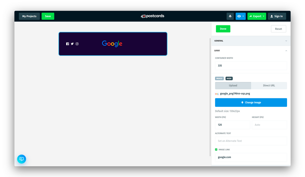 В редакторе справа заменим фон и логотип, настроим размер блока и пропишем правильные ссылки. Хорошо, если логотип будет в формате PNG и на прозрачном фоне — такие логотипы легко встраиваются в любой дизайн.