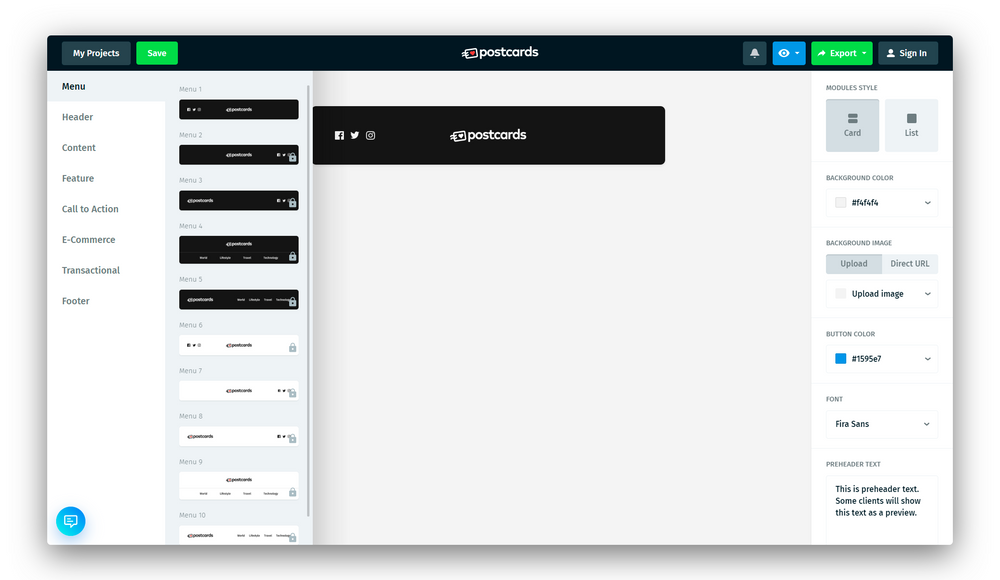 Слева на экране расположены разделы с блоками. Использовать Menu и Footer (меню и «подвал» письма) стоит во всех письмах, а остальные модули — в зависимости от формата.