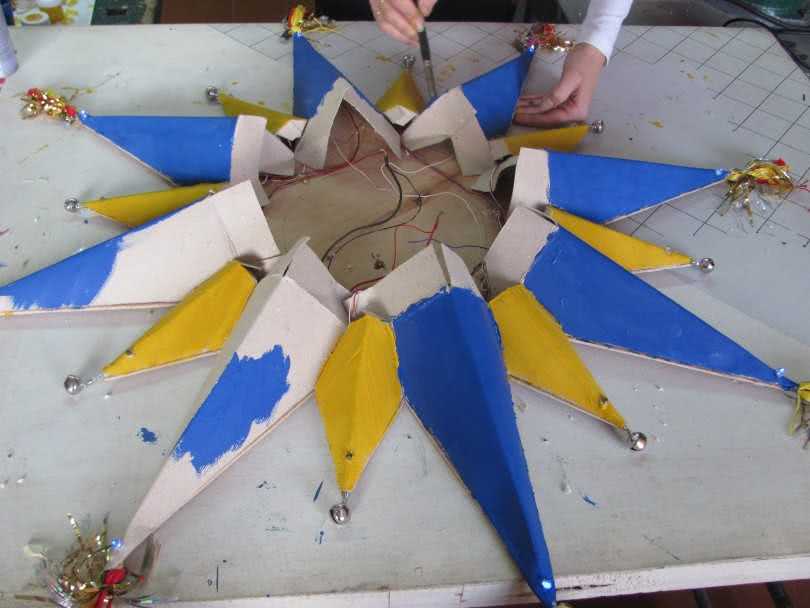 - За проклеенные полосы, которые остались в верхней части лучей, соберите украшение-звезду, поместив гирлянду внутри.