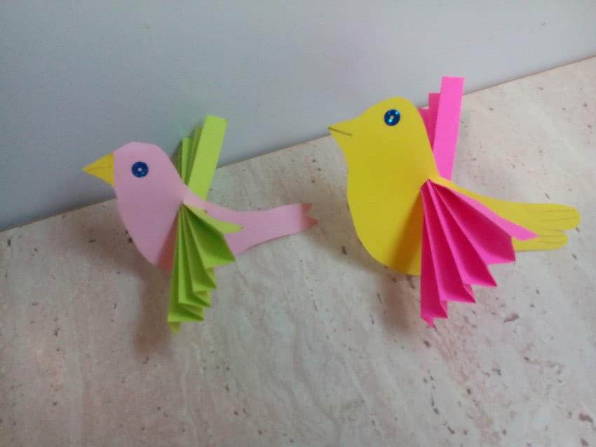 Аппликации на основе — это не единственные возможные поделки этого материала также могут быть объемными. Для их изготовления понадобятся двухсторонние цветные листы, ножницы, зубочистки, клей и бельевая прищепка. Эти птички будут состоять из тех же элементов, что и многие другие — тела, головы, хвоста, клюва и глаз. Однако в изготовлении деталей есть свои особенности. Для начала понадобится подготовить полоски определенных размеров, в зависимости от того, для изготовления какой части птицы они будут использоваться. Итак, для тела понадобится 5 бумажных полос шириной 2,5 см и следующих длин — 7,5; 10; 12,5; 15; 17,5 см. Для головы две полоски аналогичной ширины, длина которых составляет 6,25 и 8,75 см, а для клюва полоска должна иметь 5 см в длину. Для хвоста необходимо подготовить 5 полос, шириной 3,75 см, длина которых будет 5; 7,5; 10; 12,5; 15 см. Следует вырезать также два круга, диаметром 1 см — это будут глаза птицы.