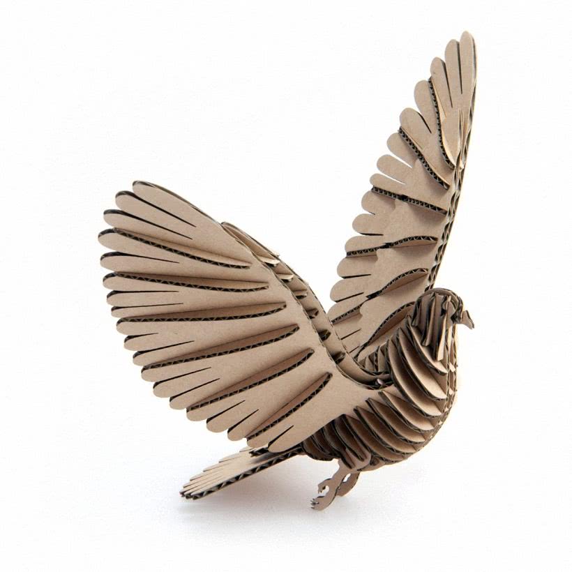 Очень оригинально смотрится, сделанная своими руками кормушка из картона, а внутри красивая птичка.