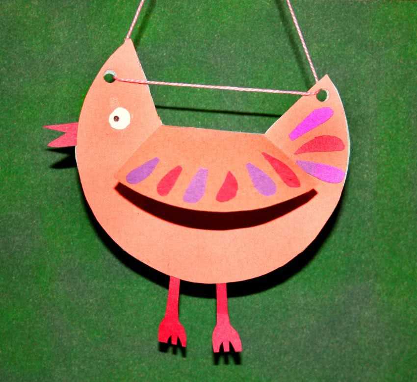 - Вырезаем из картона по чертежу – выкройке птицу, делаем аппликации в местах хвоста, клюва и лап, можно раскрасить красками или фломастерами. Складываем посредством перегиба картона с помощью линейки, приложенной по линии сгиба, чтобы не было морщин и заломов. Остается приклеить глаза и нарисовать рот. Очень просто делается птичка детьми в детском саду.