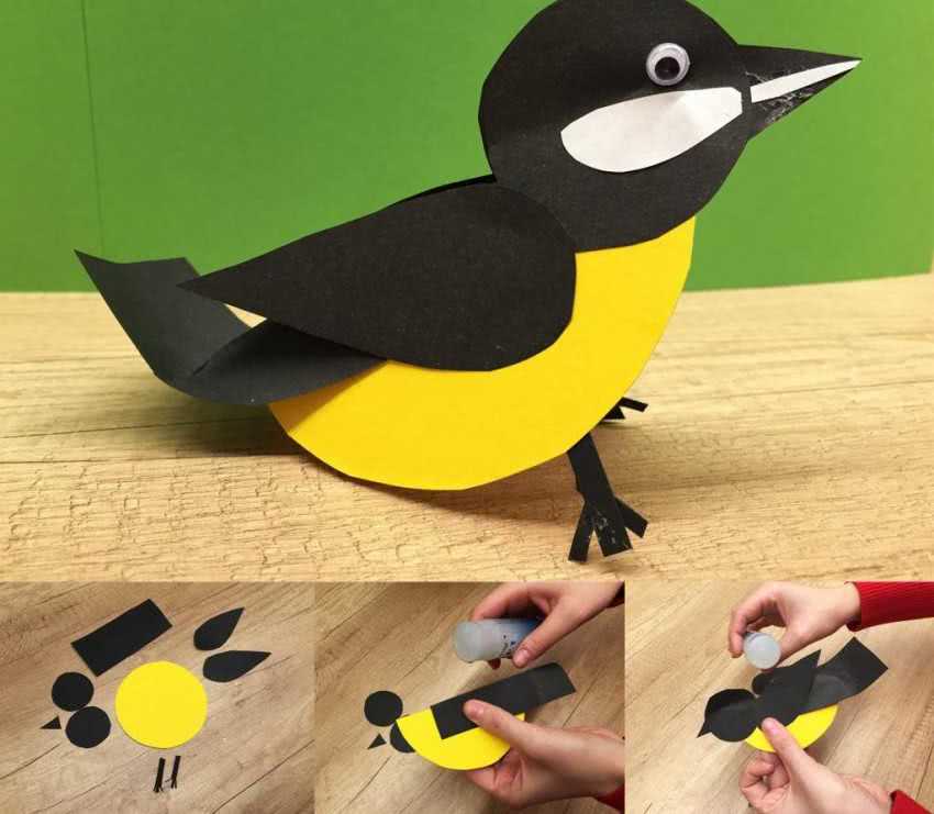 - Из картона вырезают кружочки разных диаметров: 1 желтый большой, два черных поменьше. Желтый складывают пополам – это туловище, сверху приклеивают два черных кружка – это голова. На спинку клеим полосу черной бумаги, чтобы выступала – это хвост, и загибаем его вверх, вырезаем крылья и клюв из черной бумаги, а лапки из черного картона, из белой бумаги – щеки и тонкие полоски на клюв, все это клеим на свои места. Глаза можно сделать как аппликацию.