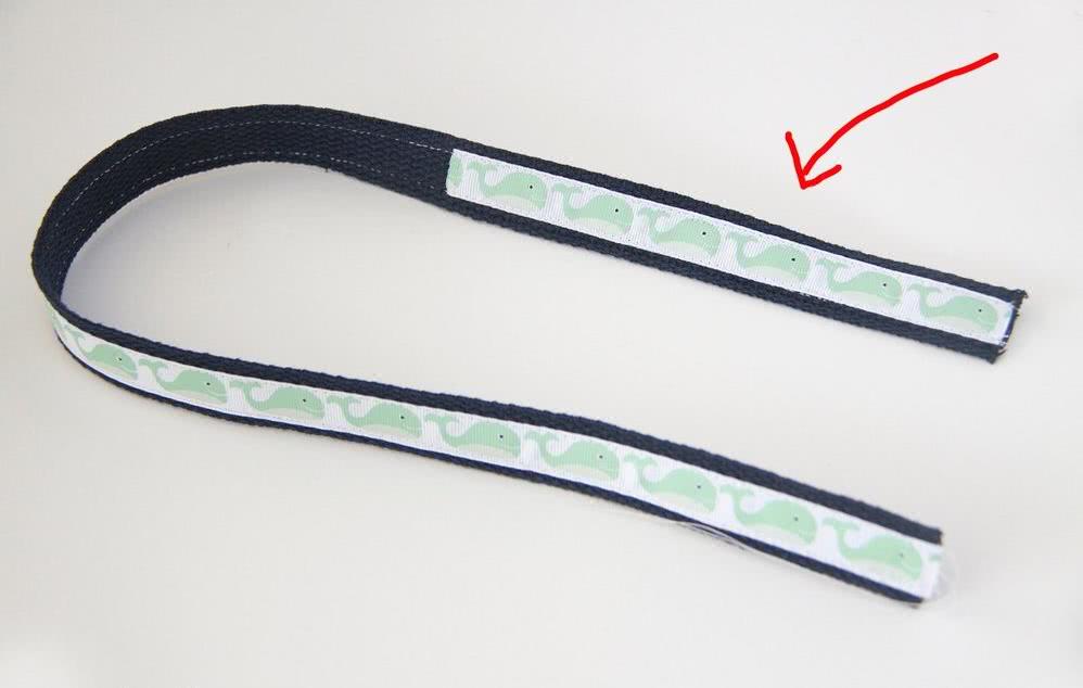 - Аналогичным способом закрепить длинный отрезок на лицевой стороне будущего ремешка.