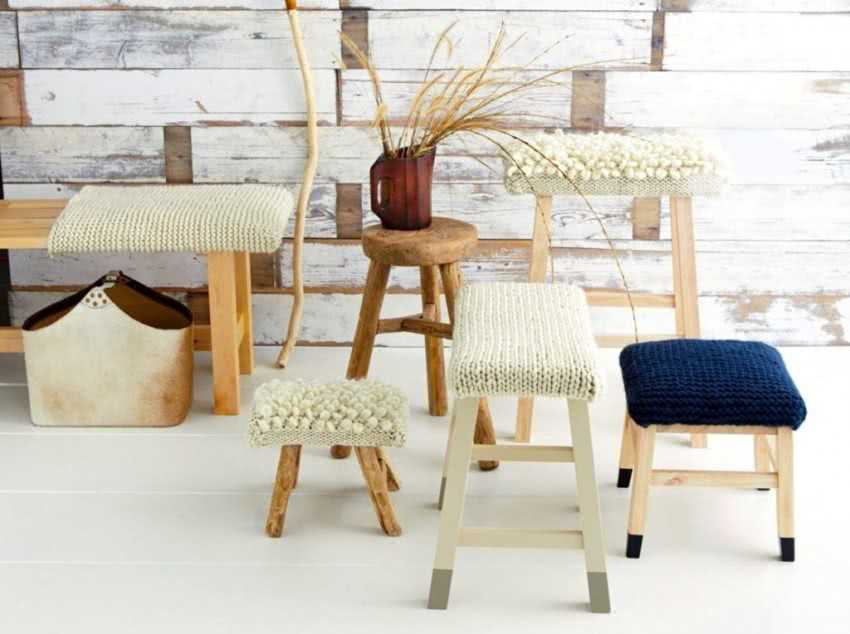 Есть разные варианты доработки табурета своими руками после изготовления – все зависит от фантазии мастера. Можно покрыть его лаком, морилкой, акрилом, нанести декоративные узоры. Украшение комнатной обстановки в технике декупаж – популярное направление мебельного дизайна. С его помощью, без особых денежных затрат, можно преобразить самодельные табуретки в зависимости от стиля помещения. Декорируют мебель салфетками, фотографиями, старыми газетами, страницами из книг или нотных тетрадей. Таким способом можно оформить интерьер в модном винтажном стиле или во французском стиле прованс. Кроме этого, можно пошить на сиденья мягкие чехлы. Накидки, связанные крючком, придадут табуретам неповторимость. В случаях, когда при ремонте меняется стиль интерьера, подчеркнуть индивидуальность жилища можно с помощью декорирования тканями. Также изменится внешний вид изделия при обмотке его деталей джутовой веревкой.