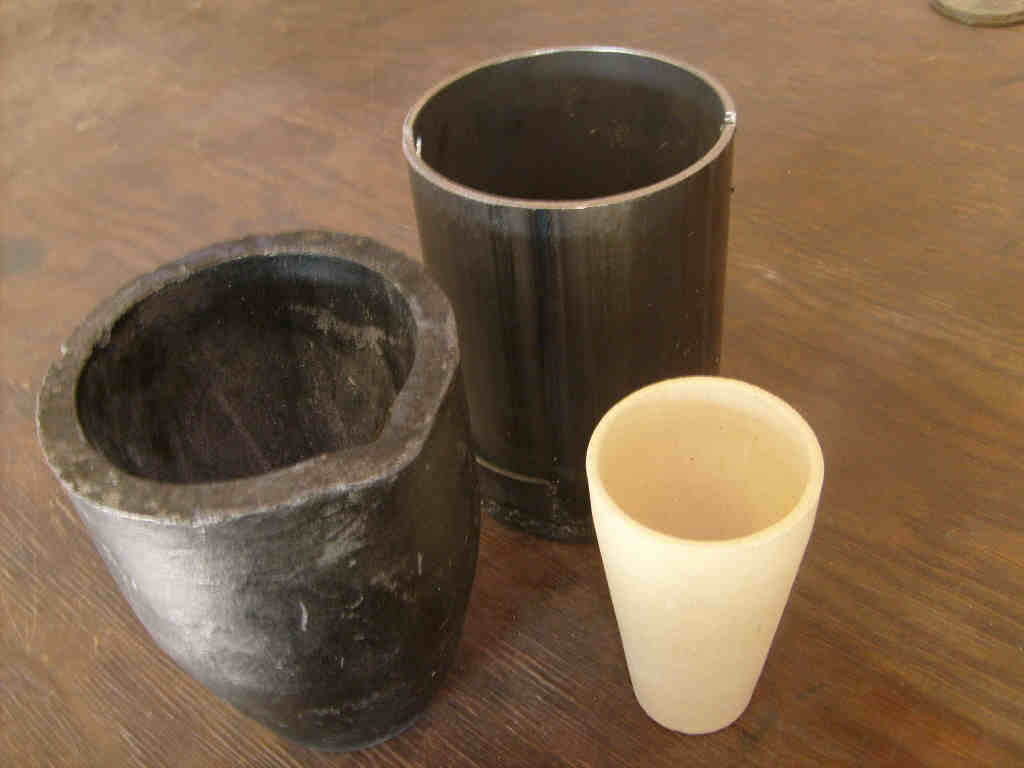 - Графитовые – пригодны для переплавки старого, окисленного лома цветных и драгоценных металлов, т.к. создают сильную восстановительную среду. Плавка серебра открытым газовым пламенем в графитовом тигле позволяет почти полностью восстановить исходный вес окисленного металла. Самостоятельно не делаются, см. ниже. Ресурс – более 100 плавок.