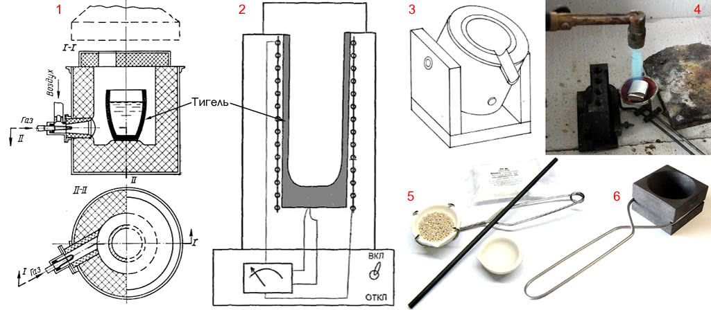 Оптимальный во всех отношениях способ нагрева тигля в печи – газом, поз. 1 на рис., но газовая тигельная печь достаточно сложное сооружение, хотя и вполне может быть изготовлена самостоятельно. Наиболее подходящий тигель для газовой печи – керамический графитированный, т.к. его материал обладает довольно высокой теплопроводностью. При особо высоких требованиях к чистоте металла лучше использовать керамический нейтральный тигель. При пониженных для легкоплавких металлов – чугунный, как лучше проводящий тепло и тем самым экономящий топливо. Графитовые тигли в газовую печь ставят, только если требуется сильное восстановление старого окисленного металла, а опасность науглероживания несущественна, напр., при переплавке извлеченного из земли серебра на аффинаж