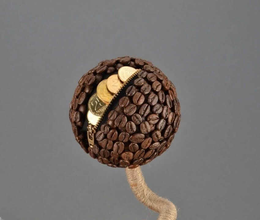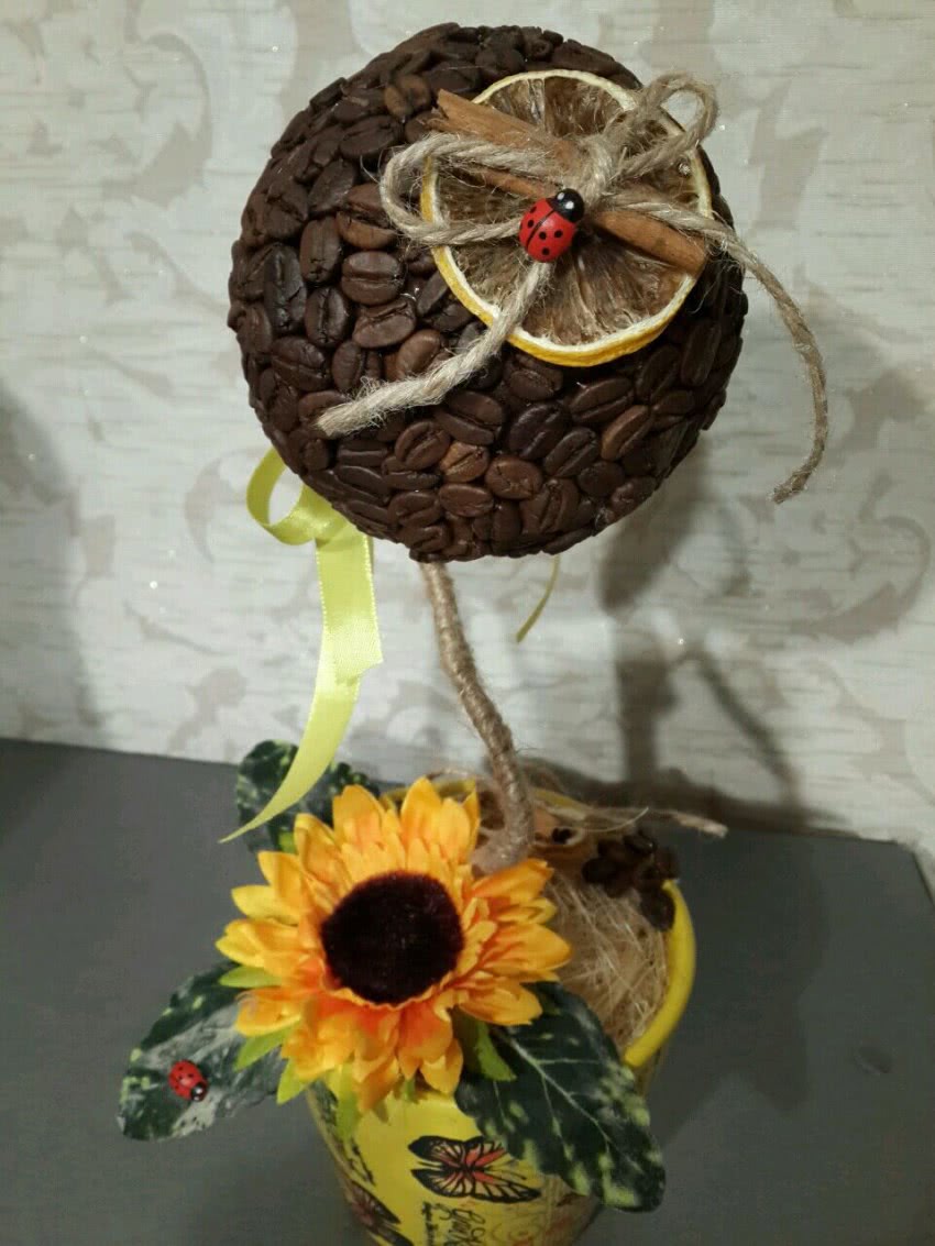 1. Приготовьте шарик из пенопласта и обмотайте его нитками, чтобы далее приклеить кофейные зерна — на нитки они клеятся лучше, чем на ровный шар. Кончики ниток можете закрепить при помощи клея.